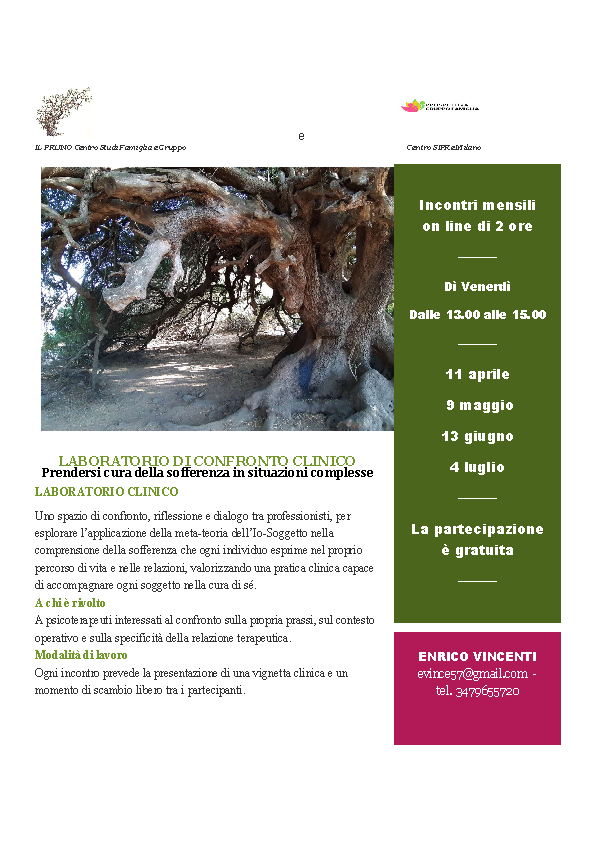 Il Pruno nasce dall’iniziativa di un gruppo di psicoanalisti della Società Italiana di Psicoanalisi della Relazione. Dopo anni di esperienza in ambito clinico, di ricerca e di docenza presso Istituti di Specializzazione in Psicoterapia, hanno sentito l’esigenza di creare uno spazio scientifico e culturale condiviso, in cui il loro metodo potesse essere messo a disposizione sia dei professionisti sia delle persone che attraversano momenti di sofferenza personale o relazionale.