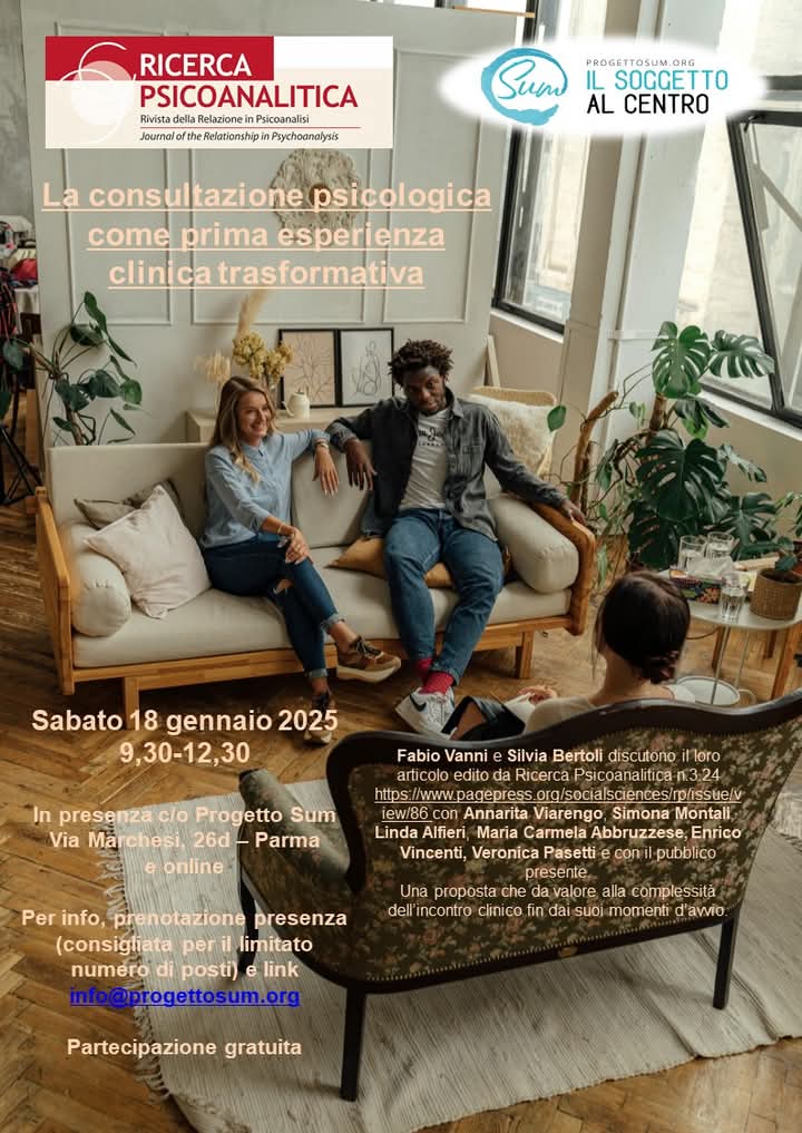 È un servizio di accoglienza e consultazione in ambito psicologico, psicoterapeutico e psicoanalitico. Ci prendiamo cura della persona, del suo sviluppo e delle crisi che attraversano il percorso di vita, accompagnando ogni individuo a viverle non solo come momenti di difficoltà, ma come possibili occasioni di trasformazione verso un’esistenza qualitativamente diversa.
